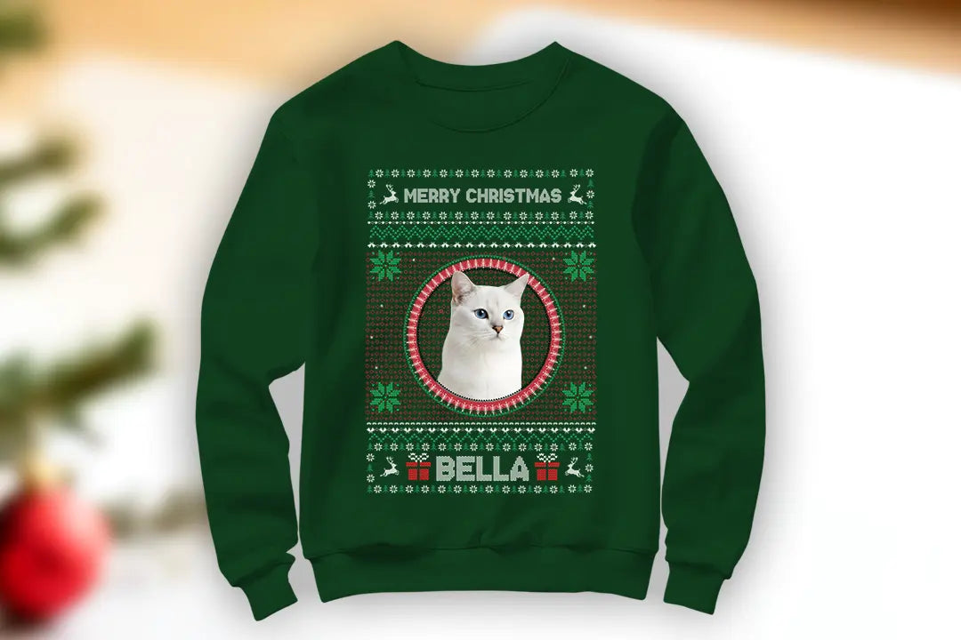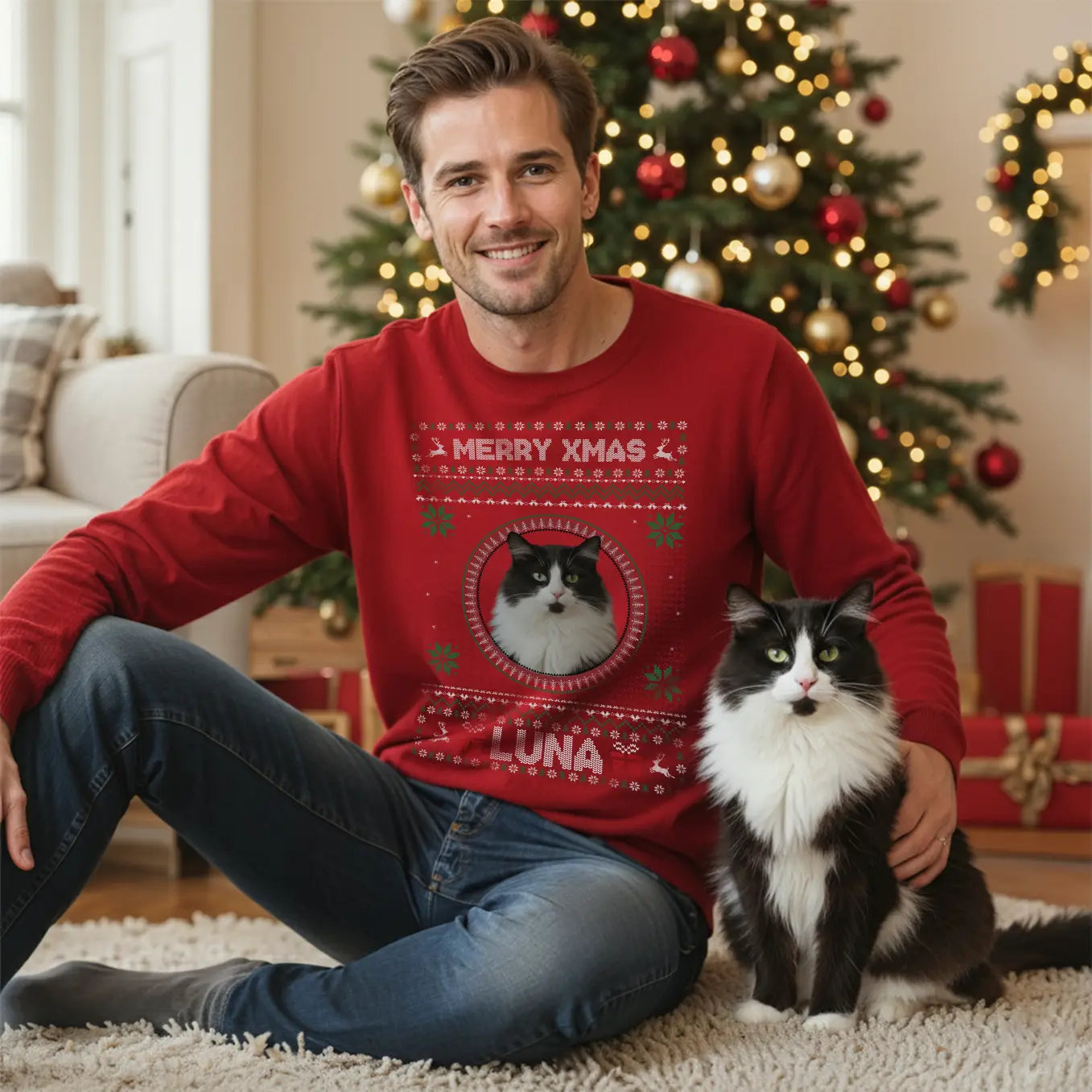 Turn your cat into the star of a one-of-a-kind Christmas sweater. Just upload your favorite photo and add a custom text to create a truly unique piece.