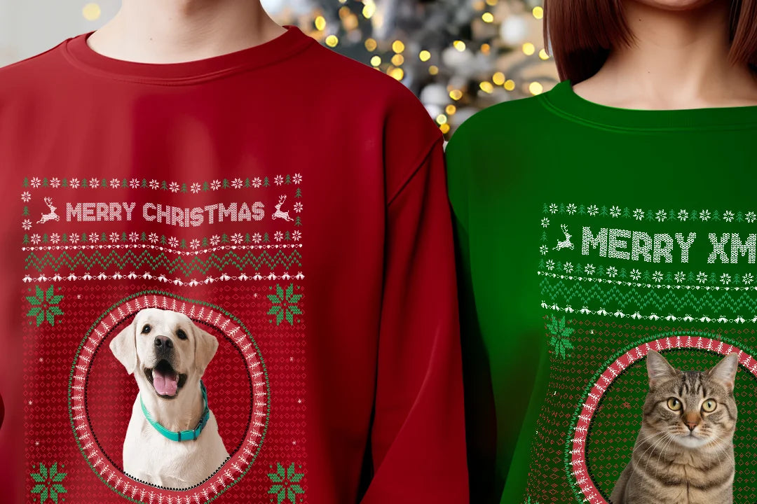 There’s nothing quite like celebrating with the pet who makes life brighter. This custom Christmas sweater adds a touch of holiday magic to every moment by turning your furry best friend into the heart of your outfit. Now, you can carry your pet into every holiday tradition with a sweater that’s personal, warm, and pawsitively festive.