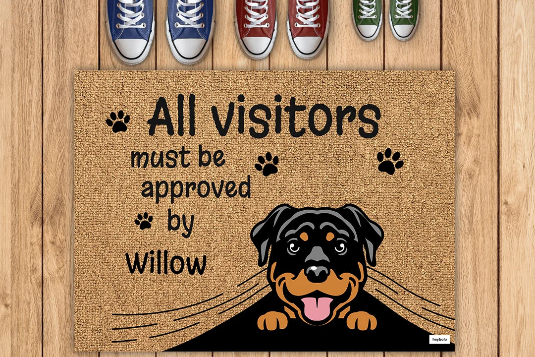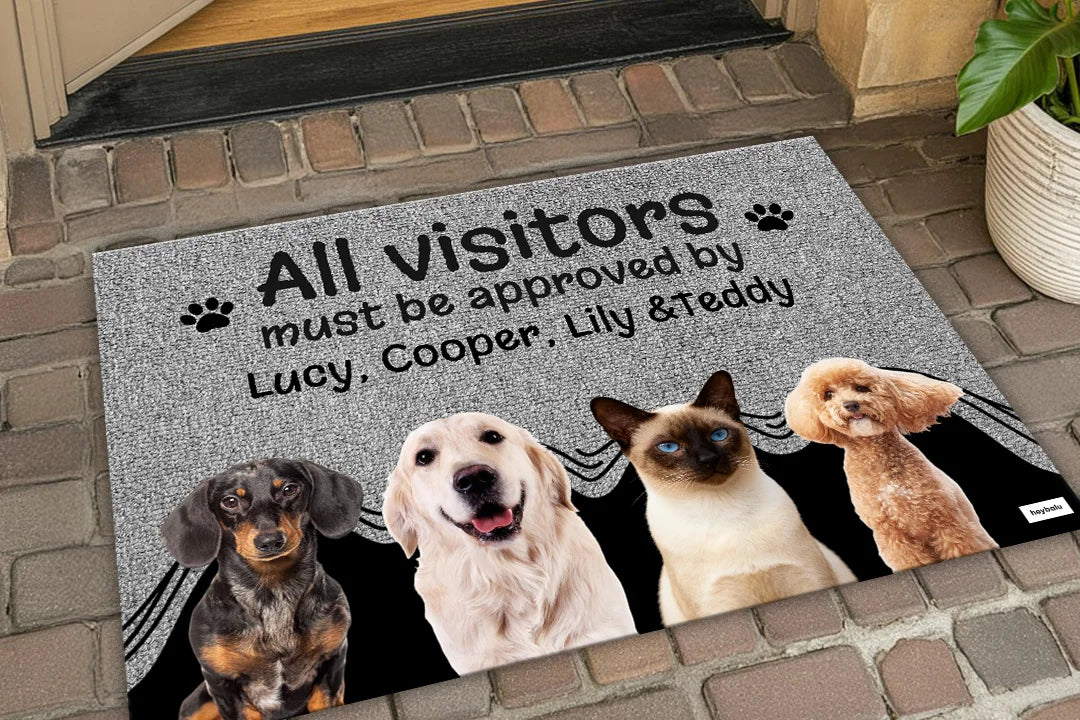 Design a charming doormat that not only keeps out dirt and moisture but also greets everyone with a heartfelt message from your furry friend. Perfect for any entryway to welcome guests and loved ones alike.