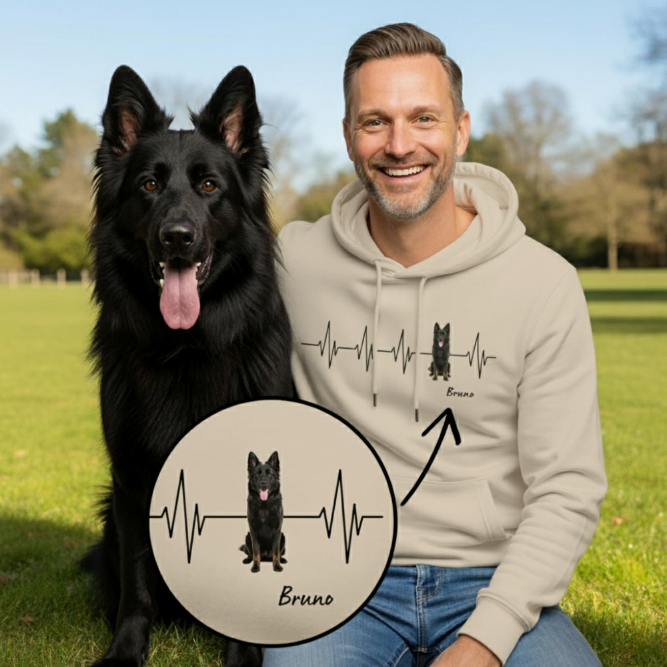Wear your pet's heartbeat close to your own with this unique hoodie. The custom design features your pet's portrait and name, celebrating your special bond. It’s a warm hug and a cherished memory in one.