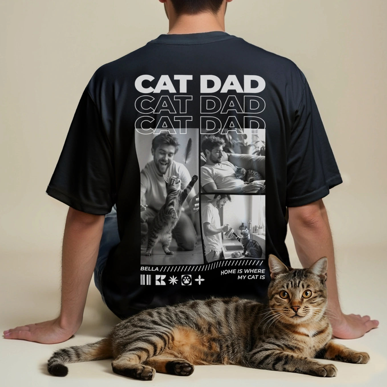 Capture your favorite moments with your cat, from relaxing on the couch to playing. Personalize this T-shirt with your best photos, your cat's name, and a special message to create a lasting memory.