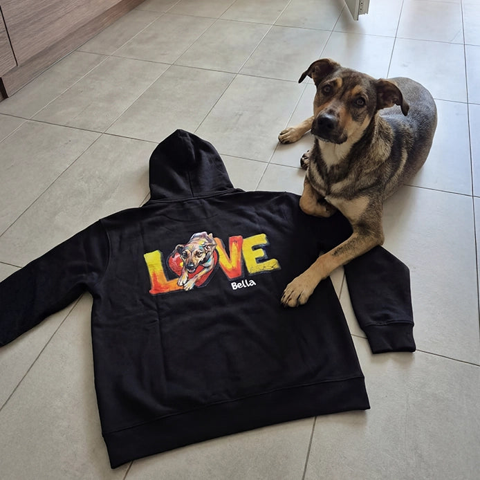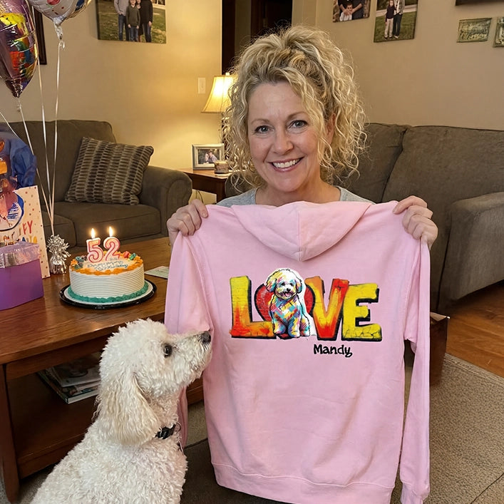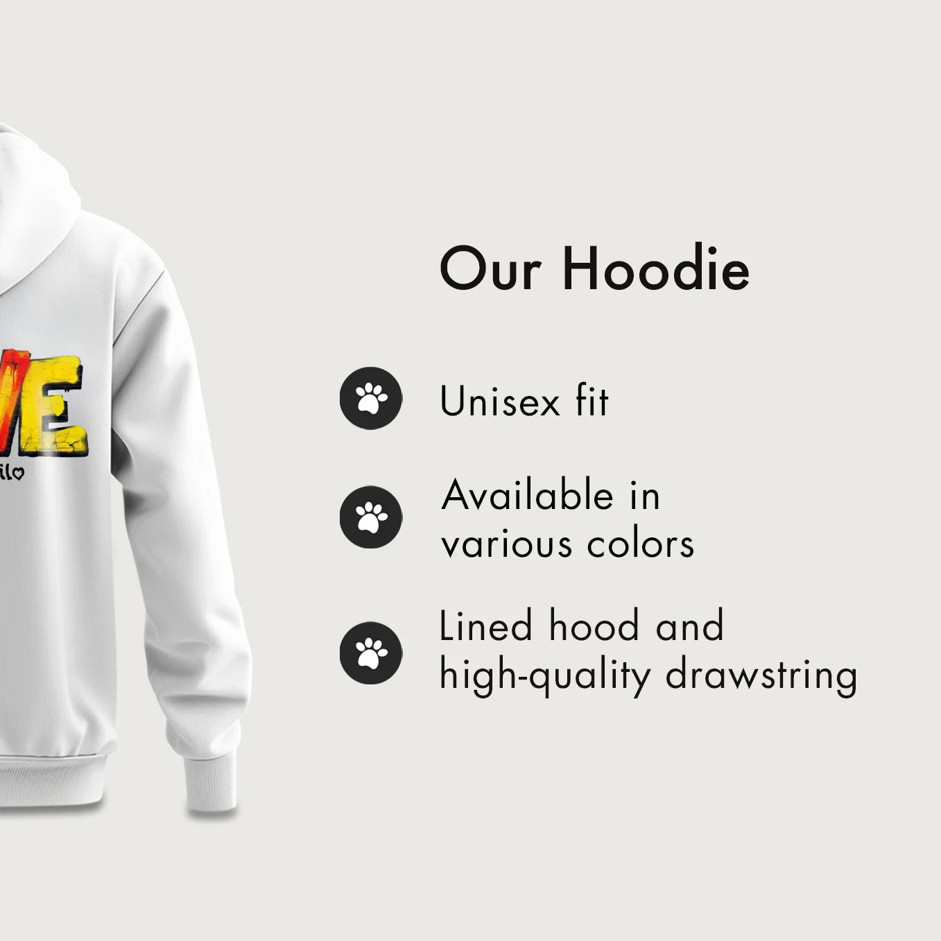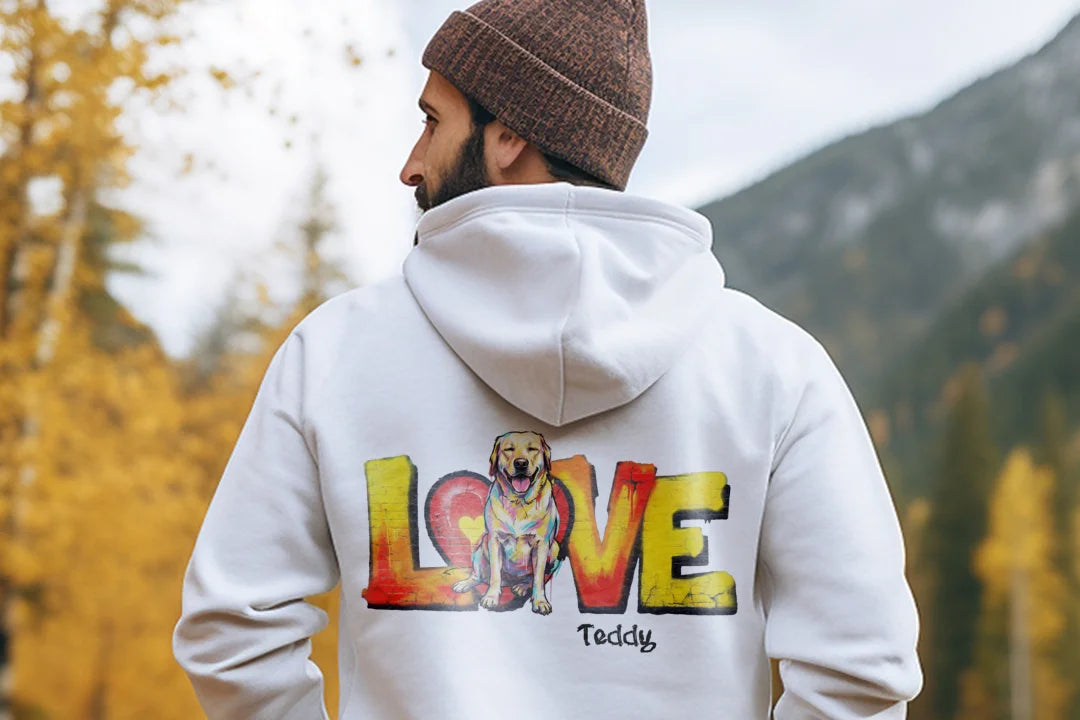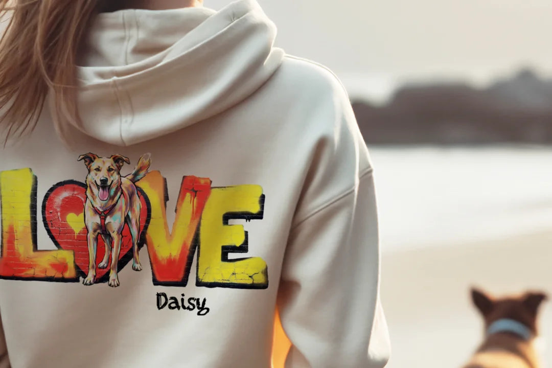 This personalized hoodie is printed with your dog’s name and illustration, making your special bond visible. Every glance at the heartfelt design reminds you of loyal eyes, wagging tails, and all the moments only the two of you share.