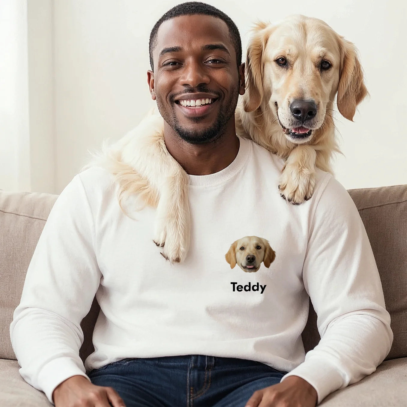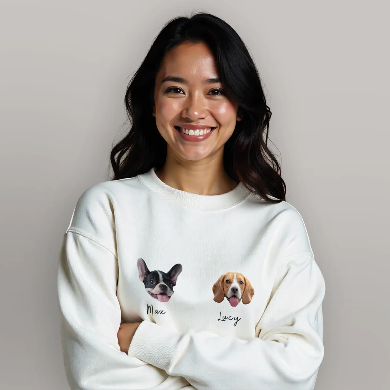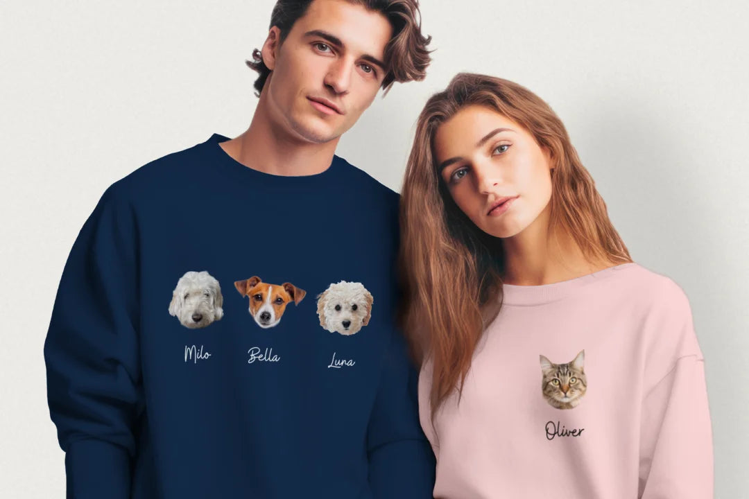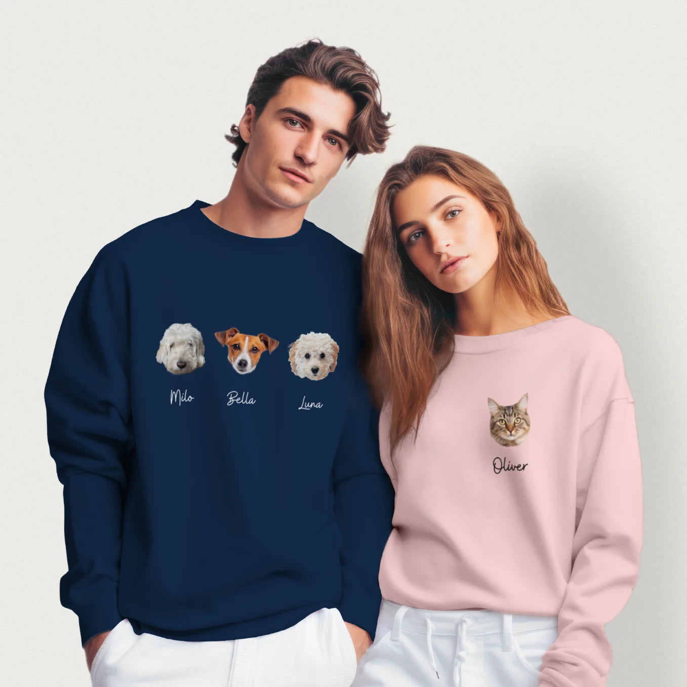 Upload a photo and see your favorite pet come to life on your sweater. Up to three pet portraits with names are possible — create a unique and personal piece of clothing that celebrates your furry friends.