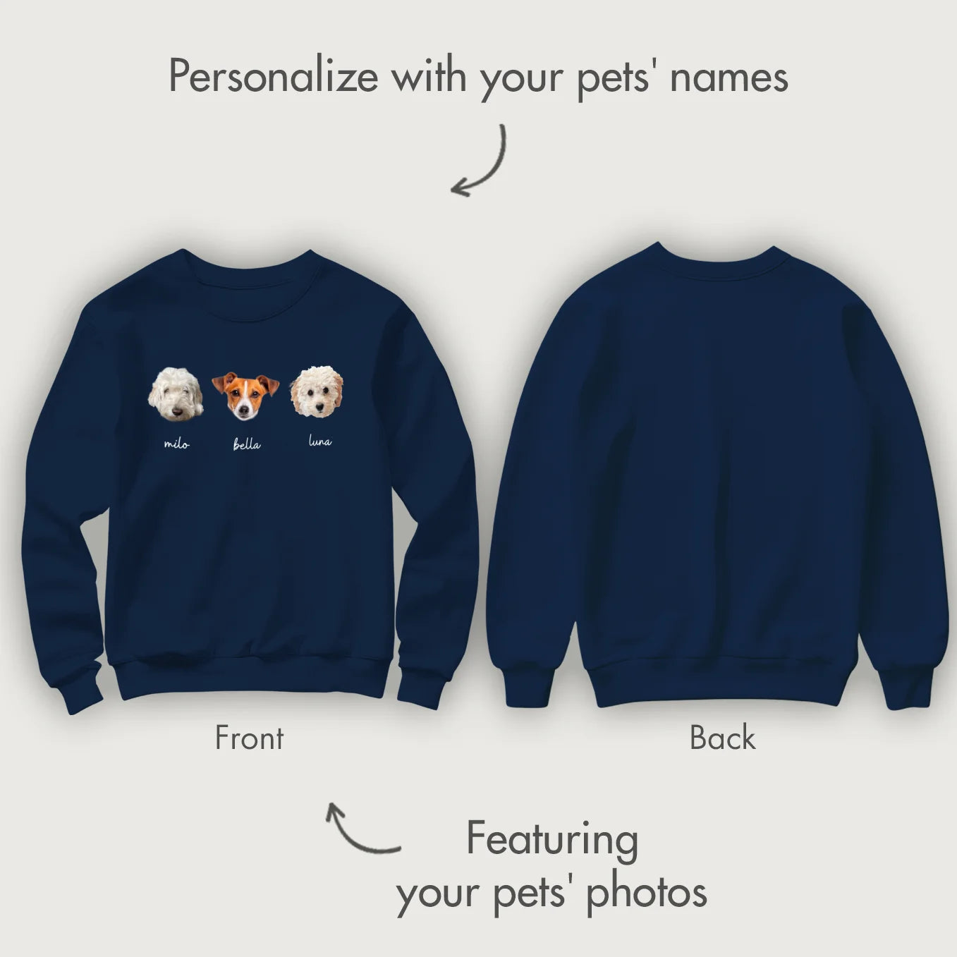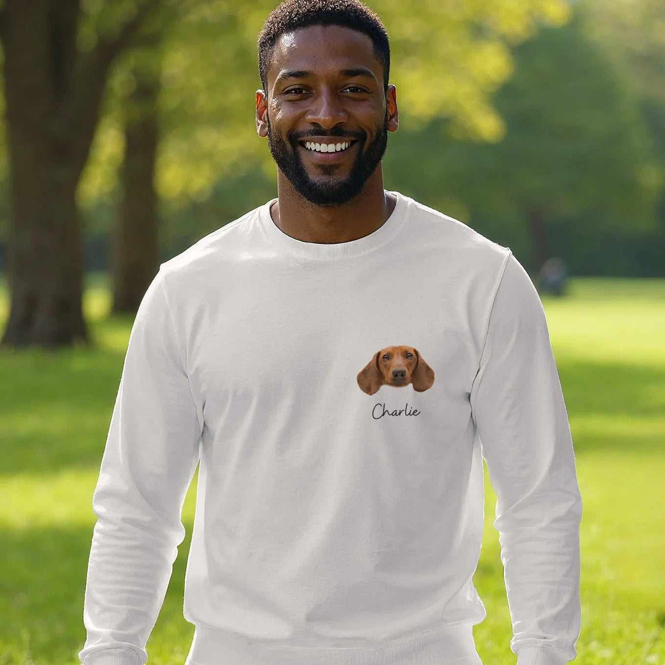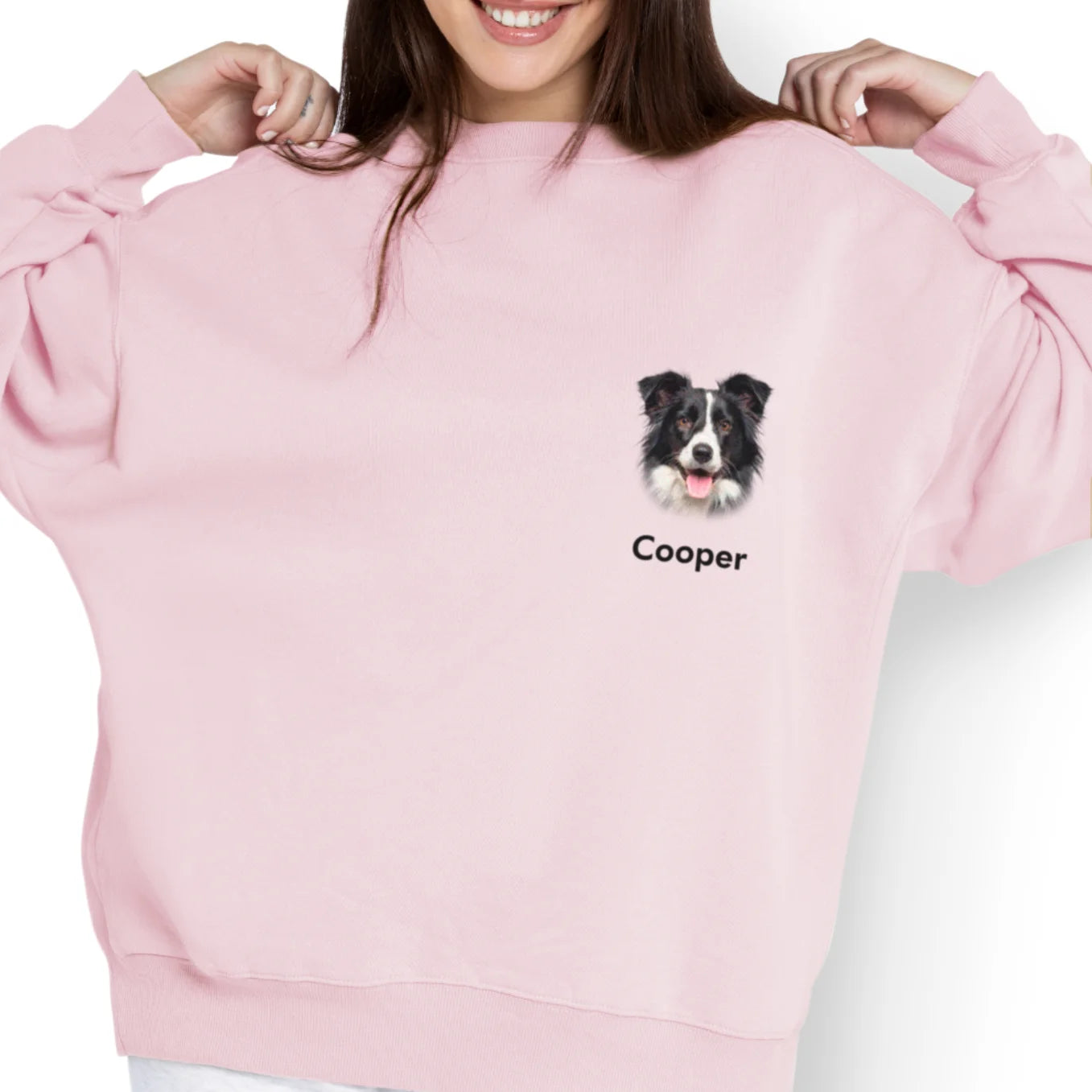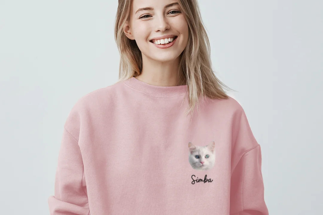 Upload a photo and see your favorite pet come to life on your sweater. Up to three pet portraits with names are possible — create a unique and personal piece of clothing that celebrates your furry friends.