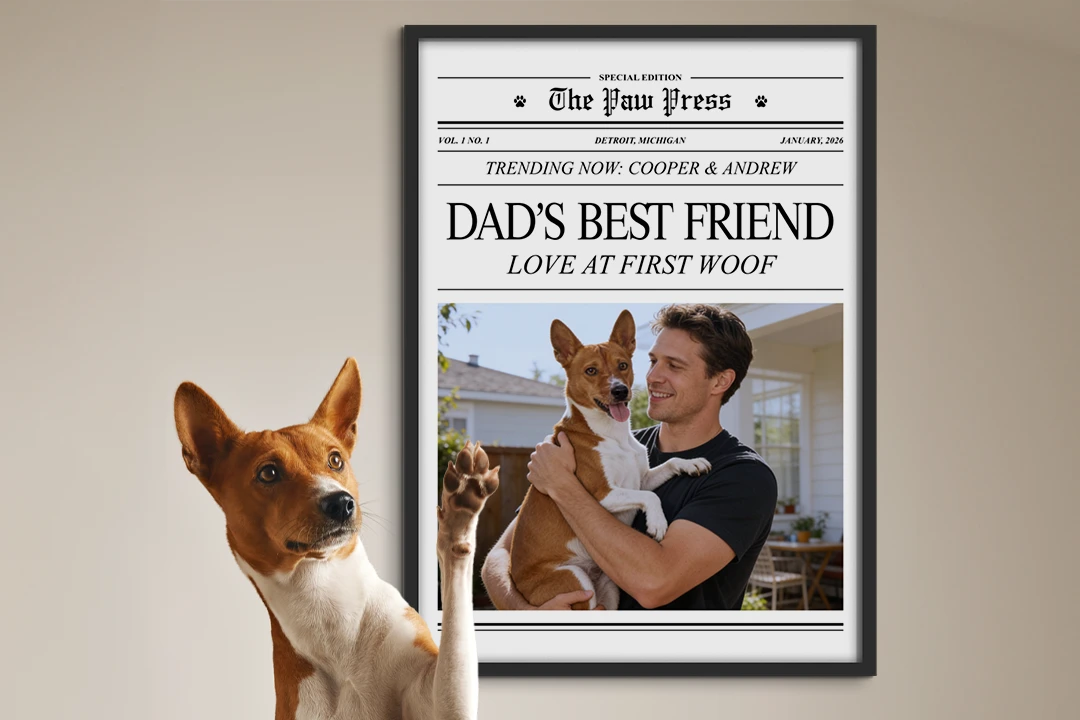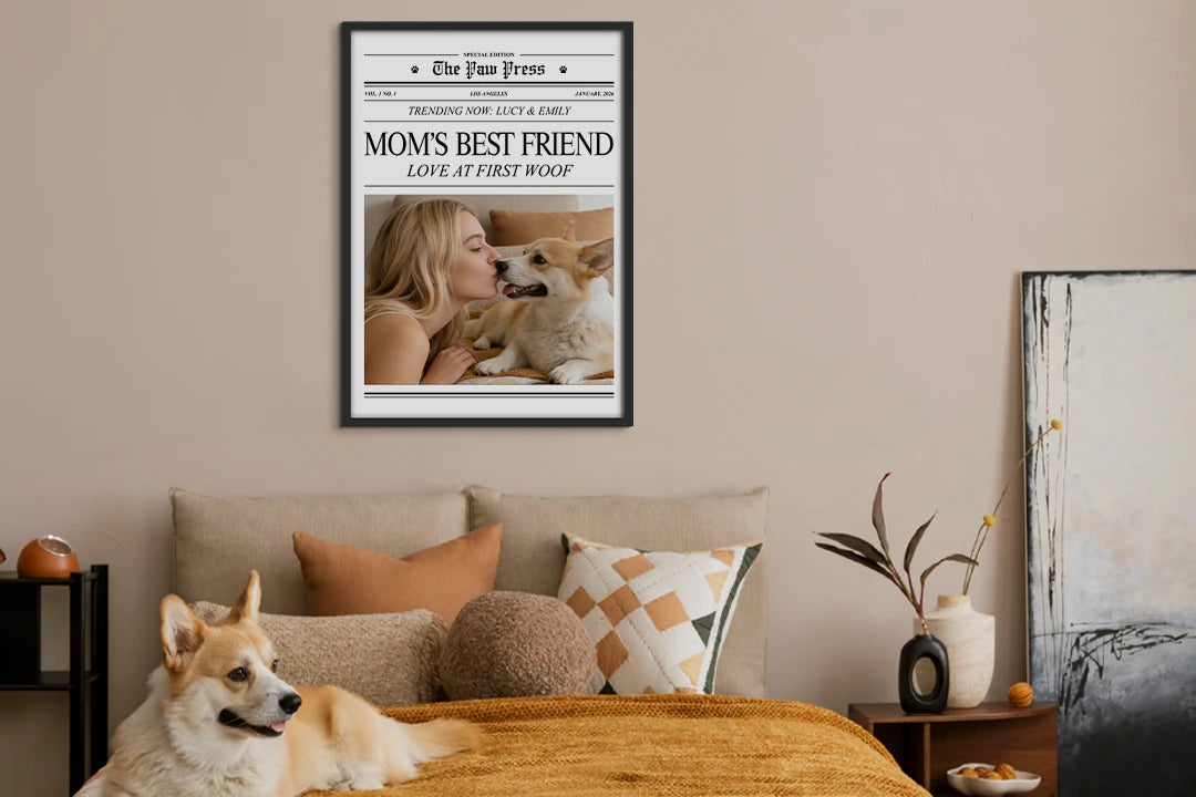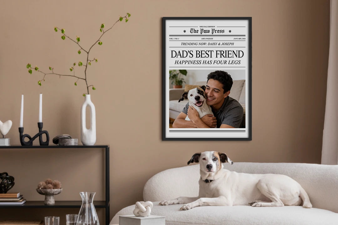 Your favorite moment takes center stage: This newspaper-style poster features you and your dog as the headline story. With names, date, and city from your photo, it becomes a touching memory – thoughtfully designed and perfect for dog lovers.