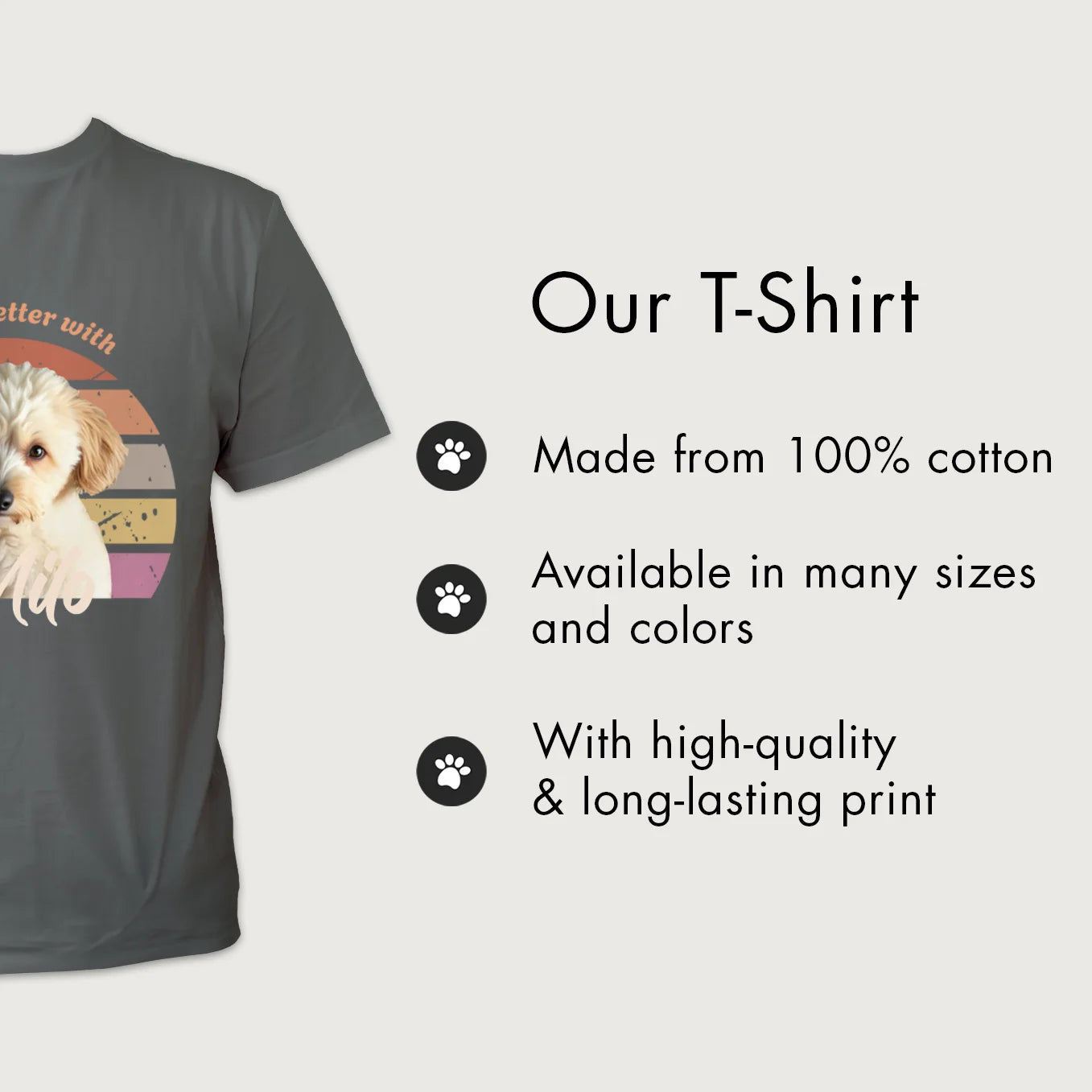 Made from soft, breathable cotton for all-day comfort. Our high-quality print brings your dog’s photo to life in vibrant color—even after many washes.