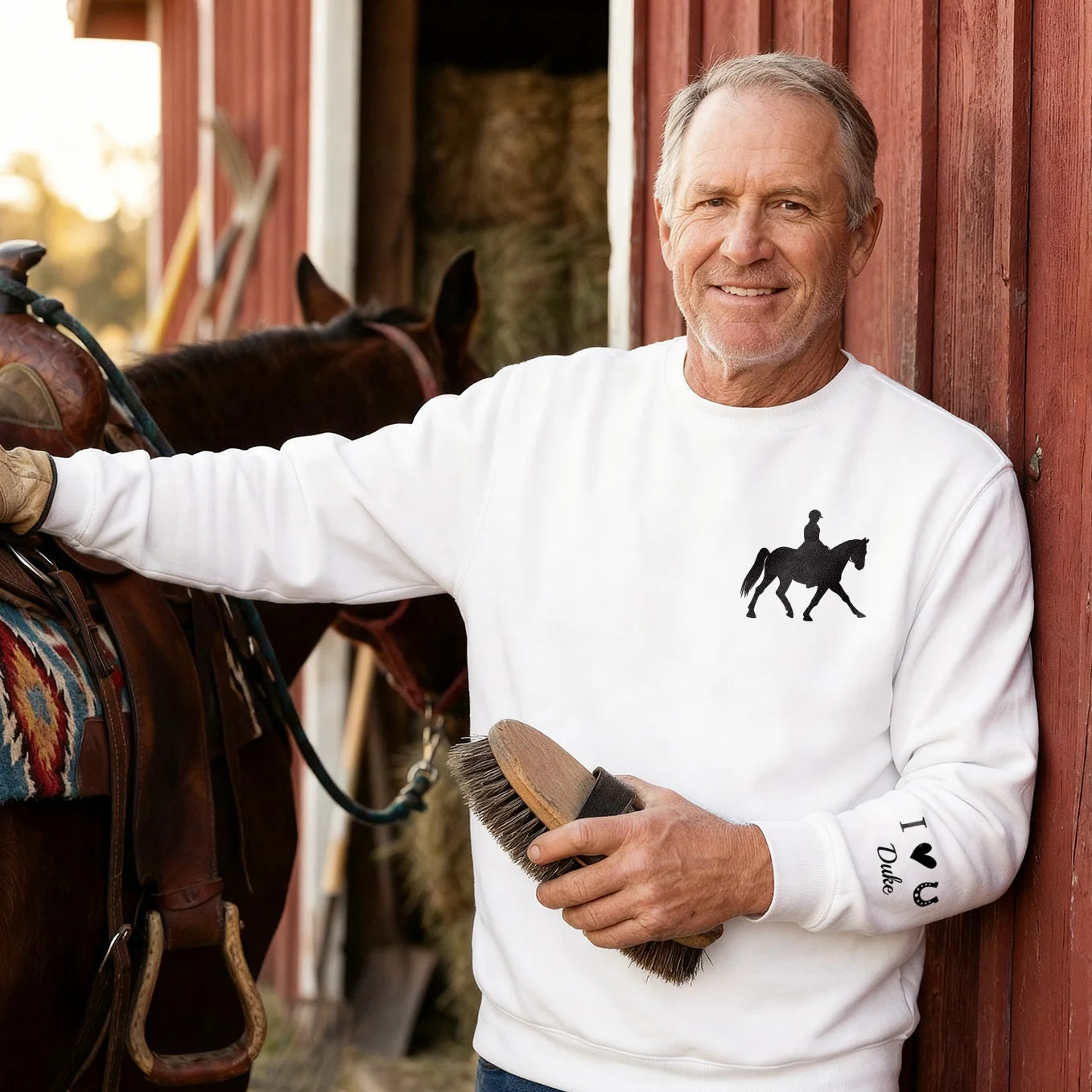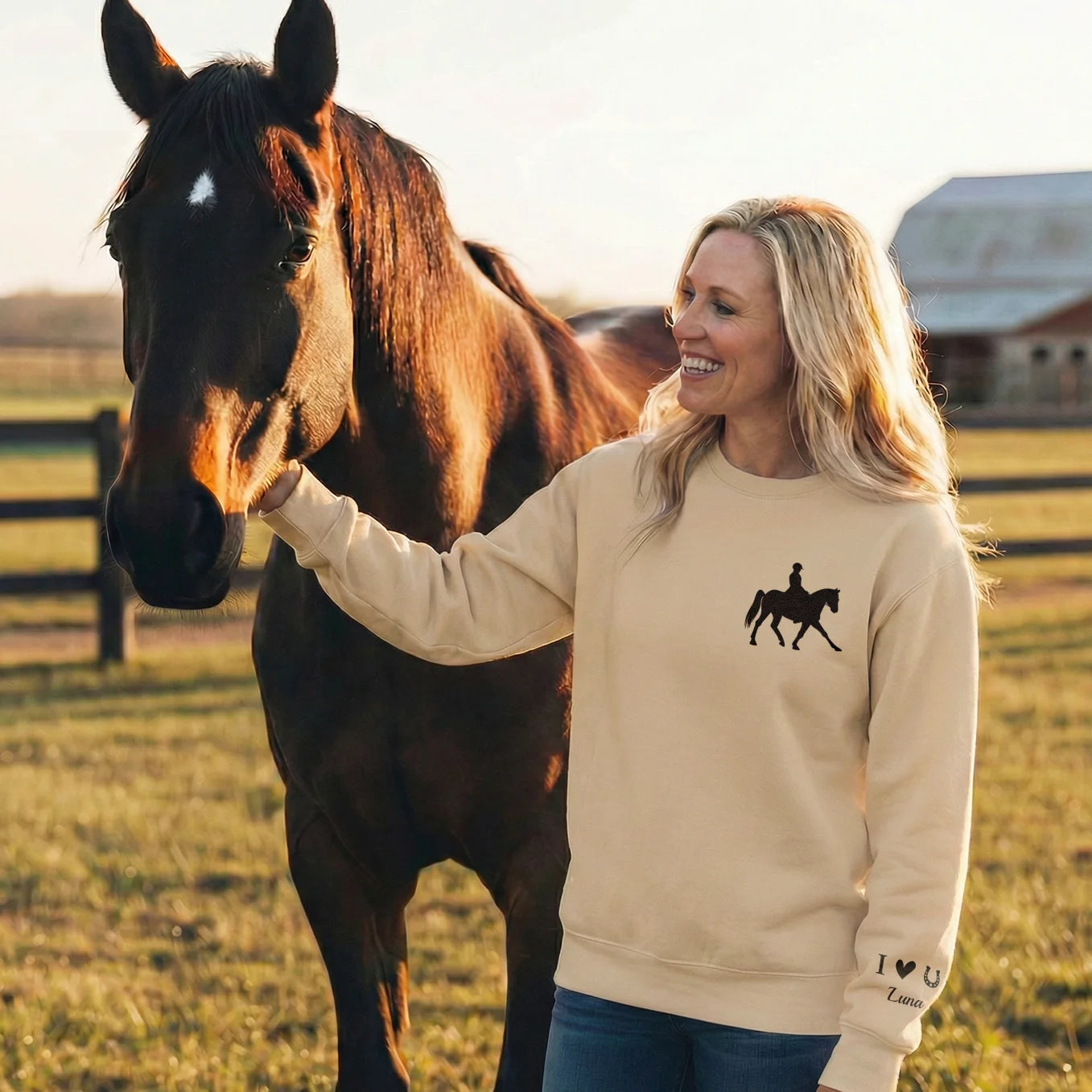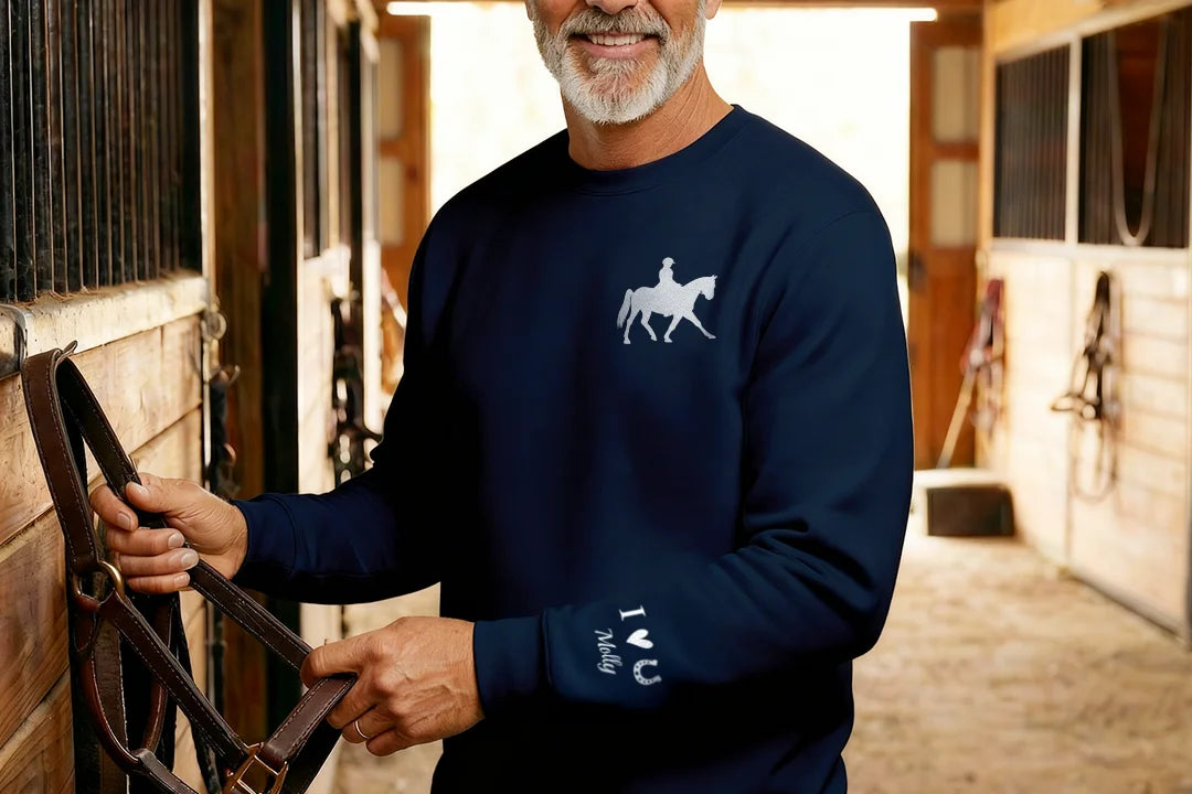 This lovingly printed personalized sweatshirt keeps your horse right over your heart. The elegant silhouette reminds you of shared rides, trust, and unforgettable moments in the saddle – customized with your chosen name.