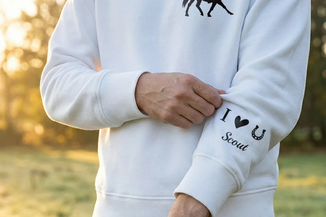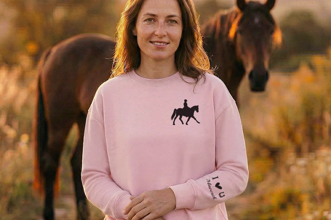 The finely printed sleeve design features your personal message: a heart and your horse’s name. This turns your personalized sweatshirt into an emotional statement piece – subtle, stylish, and full of love for your loyal companion.